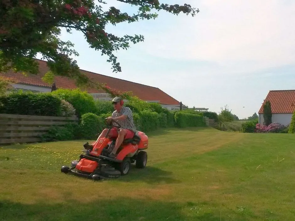 Vi har normalt to årlige arbejdsdage på fællesarealerne, ude såvel som inde, hvor vi slutter af med fælles frokost. Vi har en havetraktor, og på skift slår vi selv græs og rydder sne på fællesarealerne.